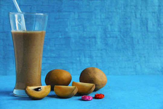 Chikoo or sapota with its juice isolated on light blue background