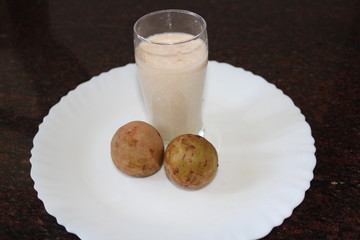 A glass of sapota or chikoo milk shake on a plate