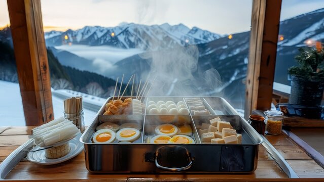 Authentic Japanese Oden Hot Pot Steaming in a Mountain Lodge with a View of a Snowy Valley and a Sea of Clouds (Unkai); A Traditional Winter Meal.