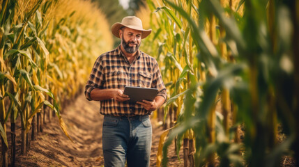 Futuristic smart farming drone with a digital hologram interface scanning a vast agricultural field at sunset for data analysis.