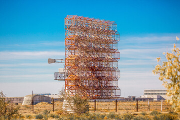Antenna at the spaceport. The tracking center at the Baikonur cosmodrome, a signaling station launching rockets. Space technology