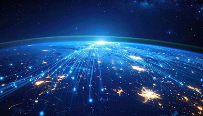 Illuminated digital pathways emanate from Earth into the cosmos, over land and sea