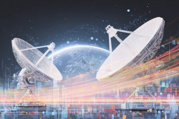 Two satellite dishes with light trails, an abstracted globe, and blurred data lines, all in a digital art style