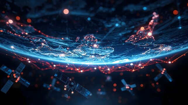 Futuristic view of Earth from space, illuminated by glowing digital data streams and network overlays, global communication, advanced technology, high-speed connectivity, and information exchange.