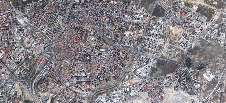 Aerial, state map and satellite view of landscape, nature and city outdoor with town pattern. Land, urban and above with houses, neighborhood and roads with commercial development from top terrain