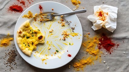 Dirty plate with leftover food, fork, spices, and crumpled napkin meal dinner