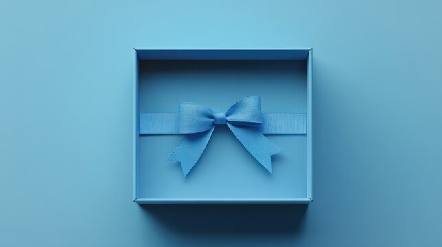 Blank open blue gift box with blue bottom inside or top view of opened blue present box with blue ribbon and bow isolated on blue background with shadow minimal concept 3D rendering