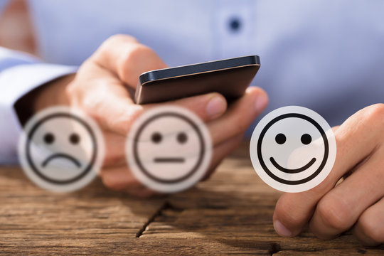 Service rating, satisfaction and positive feedback concept. Customer show smile face emoticon for rating