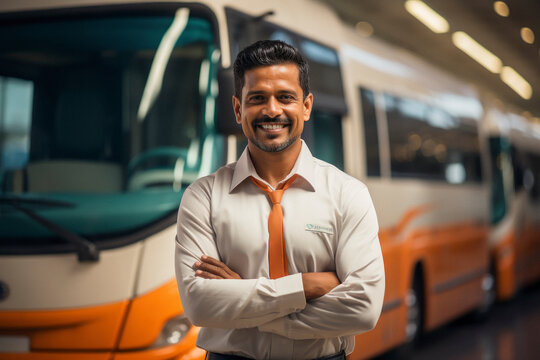 young indian corporate employee standing in front of bus