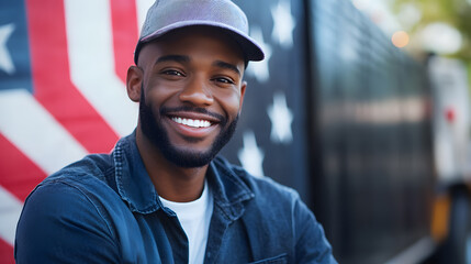 Happy African American man with curly hair and beard wearing sunglasses smiling in car interior during sunny day road trip vacation travel lifestyle.