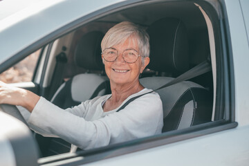 Senior woman smiles satisfied after parking the car. View from outside the car. Caucasian senior female.