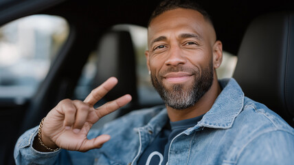 Black driver inside stylish car interior radiating confidence with hand sign gesture emphasizing driving satisfaction, comfort, and safe transportation services
