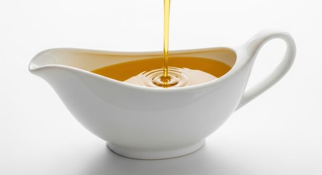 Olive oil being poured into a white gravy boat creating ripples in the golden liquid