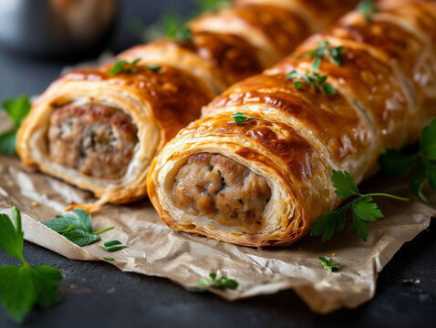 Traditional British Sausage Roll. Close-up on freshly baked sausage rolls on a dark country style background. Foodie rustic patisserie - takeaway comfort food.