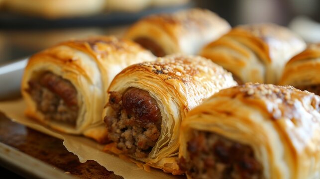 Newly made sausage rolls with puff pastry cooling on a tray