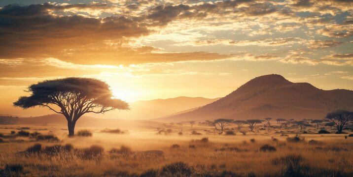 Majestic tree in golden sunset light over vast savanna landscape, copy space