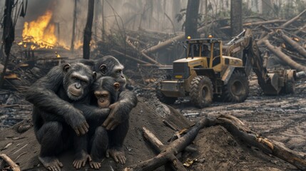 A family of chimpanzees hugged each other in a fire-ravaged forest, they were sad. Their homes quickly disappear to bulldozers and flames, environmental disaster, deforestation, Save animal wild