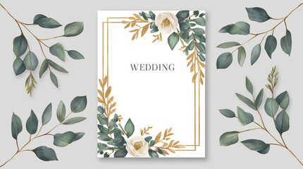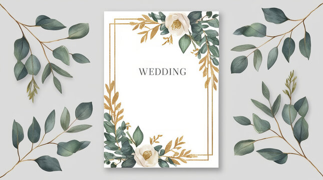 Blank invitation or greeting card mockup with flowers, wedding card flat lay