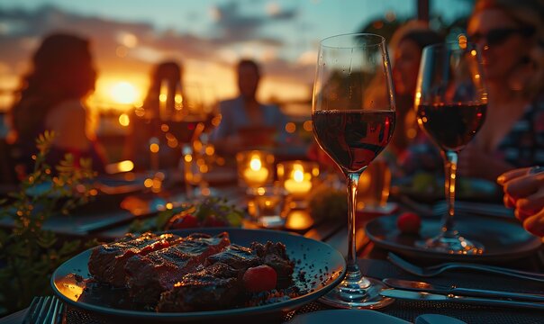 A happy family is having a vibrant BBQ dinner party on a restaurant rooftop, savoring meat and red wine with friends.