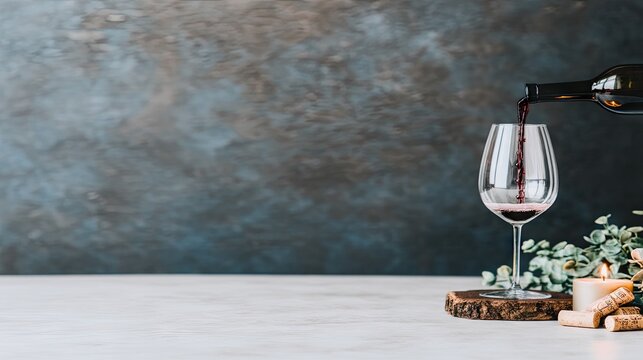 Pouring red wine into a glass with wooden corks and greenery on a light surface against a textured background