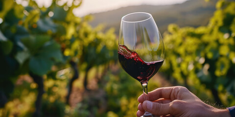A hand holding a glass of red wine against a picturesque vineyard backdrop.
