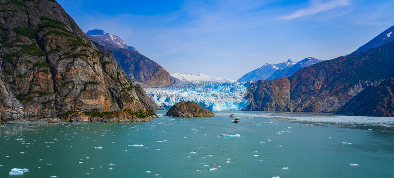 Panoramic view of South Sawyer Glacier at the end of Tracy Arm Fjord in southeast Alaska, USA - Coastal glacier in the Pacific Ocean