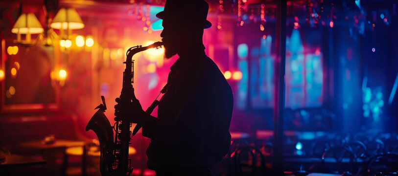 silhouette of a man playing the saxophone. jazz cafe. musician