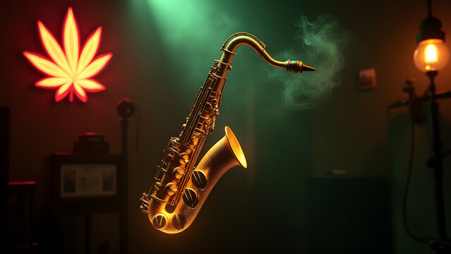 Leaf-bell saxophone with glowing bud keys in smoky jazz club setting.