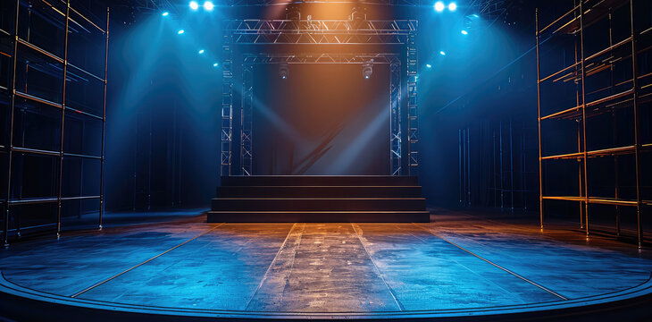 Theatrical spotlight casting dramatic beams through haze across rigging grid and scaffolding