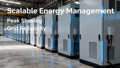 Large industrial battery storage units and solar panels in a sunny, remote, desert-like environment.