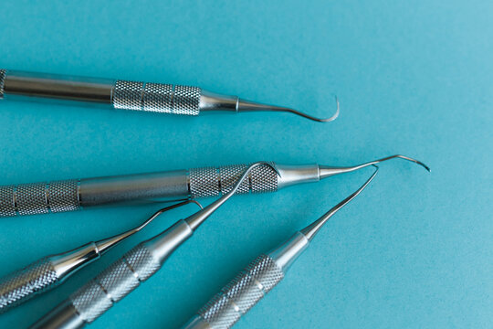 Lot of dental periodontal scalers on blue background