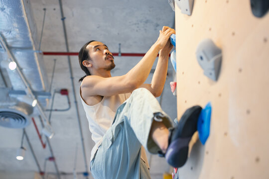 Man focused on ascending indoor rock climbing wall