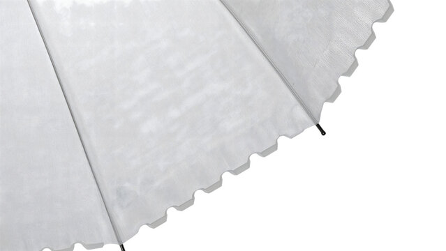 Close up of white parasol canopy with scalloped edge and metal frame on the transparent background, minimalist sun protection concept
