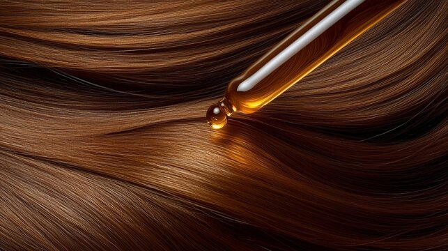 The woman's shiny hair, stroked by an oil dropper above it on the white background. 9