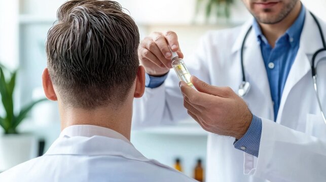 Male scalp application of peptide hair serum with dropper, anti hair loss treatment, trichology procedure, follicle support formula, cosmetic science background, restorative haircare process care