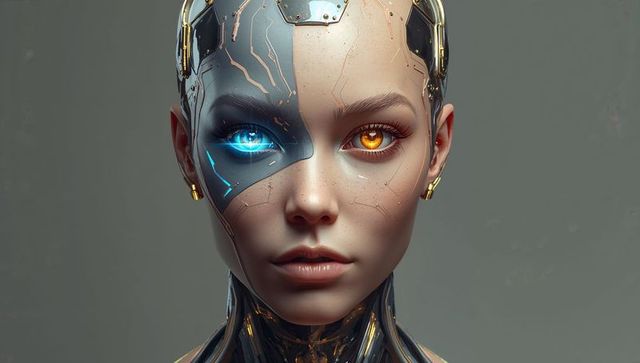 Displaying futuristic female cyborg with biometal plating and glowing duo-colored eyes