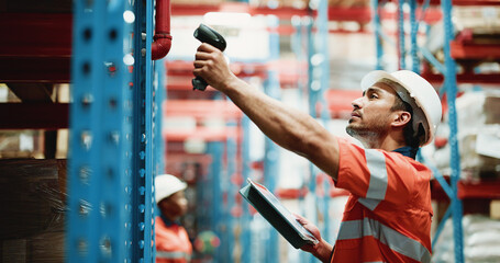 Logistics, tablet and scan with man in warehouse for quality assurance, cargo and shipping. Inventory manager, online inspection checklist and distribution with person in factory for delivery report