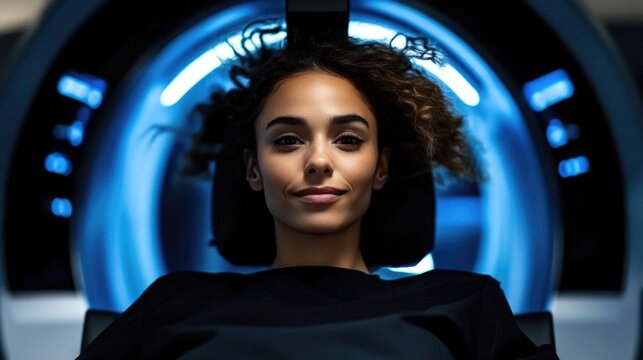 Professional Doctor Radiologist In Medical Laboratory Controls magnetic resonance imaging or computed tomography or PET Scan with Female Patient Undergoing Procedure.