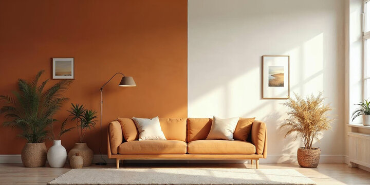 Modern minimalist living room with a clean, symmetrical design. The wall and sofa are split vertically into brown and white sections, decorated with pottery, plants, and frames in Scandinavian/japan