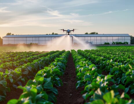 Drone rises scanning field as greenhouse opens and sprayers arc, blending natural calm with advanced agricultural innovation
