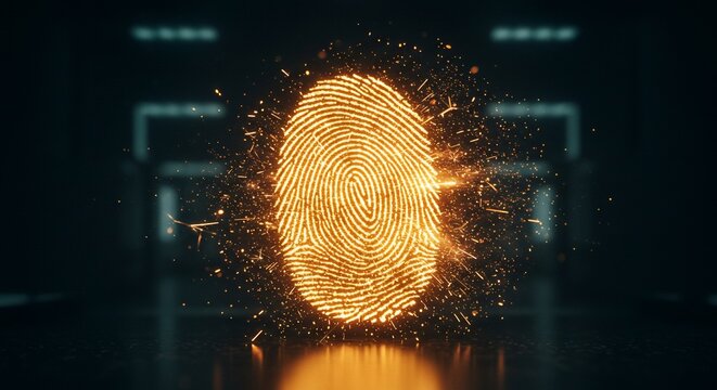 Glowing Fingerprint with Spark Effects on Dark Background, Digital Security Concept