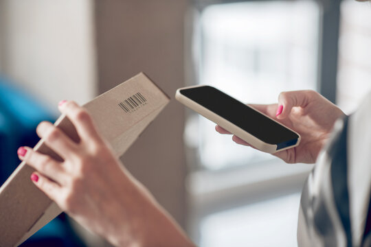 Internet shop worker scanning information on the product package