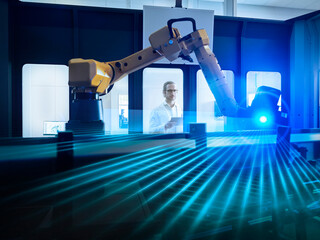 Mechanical scanning robot projecting red beam across static object with polished clean floor in open neutral background emphasizing analysis precision