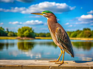 A sleek green heron stands poised on a weathered wooden dock, scanning the serene summer lake waters beneath a warm, sunny blue sky.