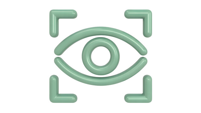 A soft pastel green rounded three dimensional eye icon is centrally displayed surrounded by target scanning brackets against a deep dark black backgro
