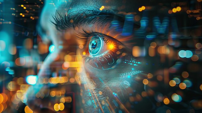 Futuristic artificial cyber eye illuminated with glowing neural circuits and radiant fiber optic light rings, resembling advanced biometric scanning or high-tech digital surveillance technology system