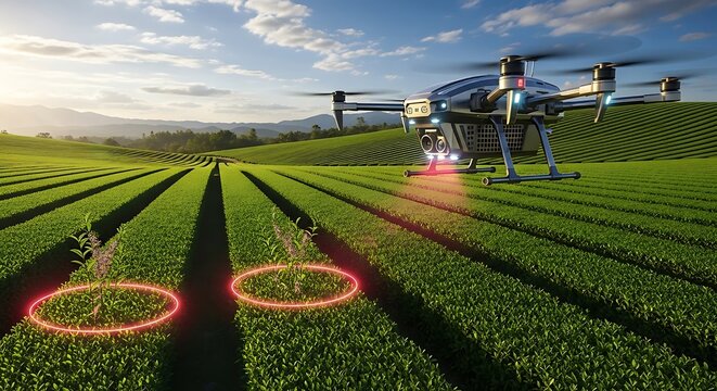 Agricultural drone scanning crops with glowing red circles on plants agriculture farming