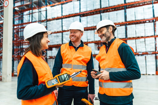 A warehouse worker wearing a yellow helmet and orange vest uses a handheld device to manage inventory in a large storage facility with tall shelves.
