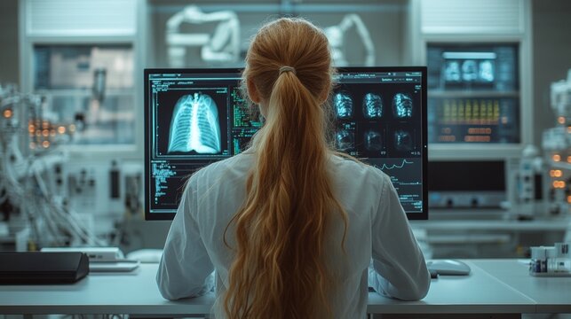 Medical diagnostic analysis: A female doctor operates cutting-edge imaging and scanning systems displayed on various monitors in a futuristic medical setup