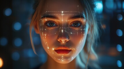 A woman in a black hijab smiles while facial recognition technology analyzes her features. The neutral background emphasizes the facial mapping points displayed on her face.
